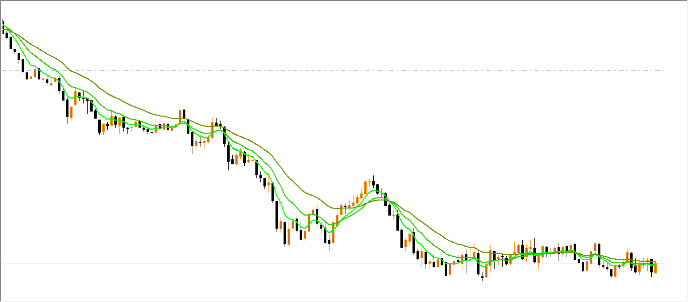 The GMMA indicator consists of two groups of exponential moving averages (EMAs):