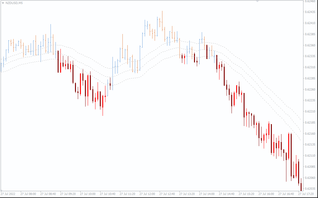 The indicator relies on color-changing candles and three dynamic bands to show the trend direction: