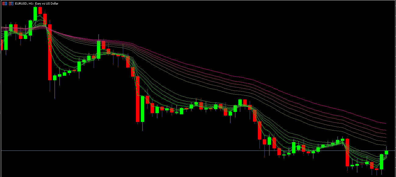 The indicator displays 12 EMAs, divided into short-term (30, 35, 40, 45, 50) and long-term (120) periods. The EMAs are color-coded in red for clarity. Using exponential moving averages allows the indicator to reduce lag while increasing sensitivity to price changes, giving traders an edge in detecting early trend formations.