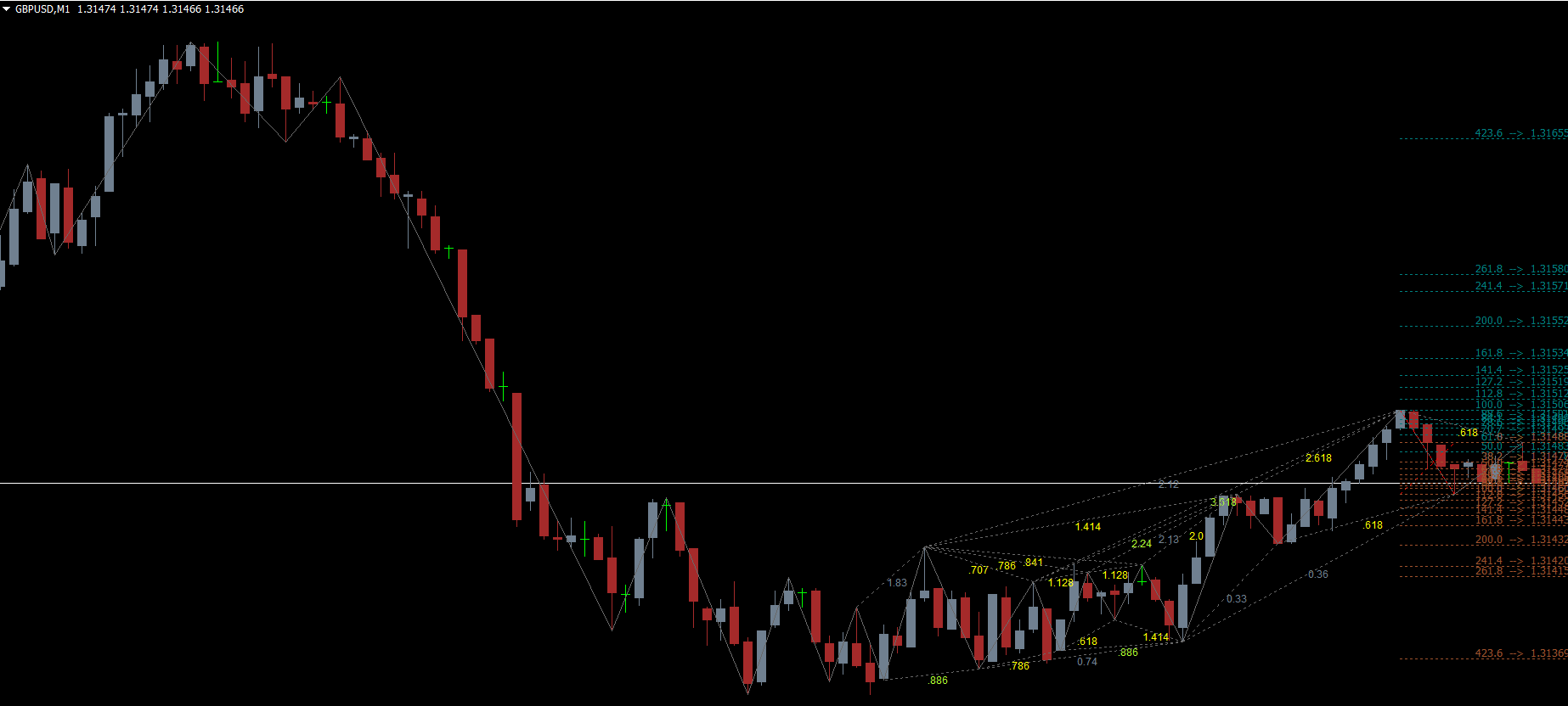 The indicator uses a combination of Zigzag levels and Fibonacci retracements/extensions to automatically detect harmonic patterns: