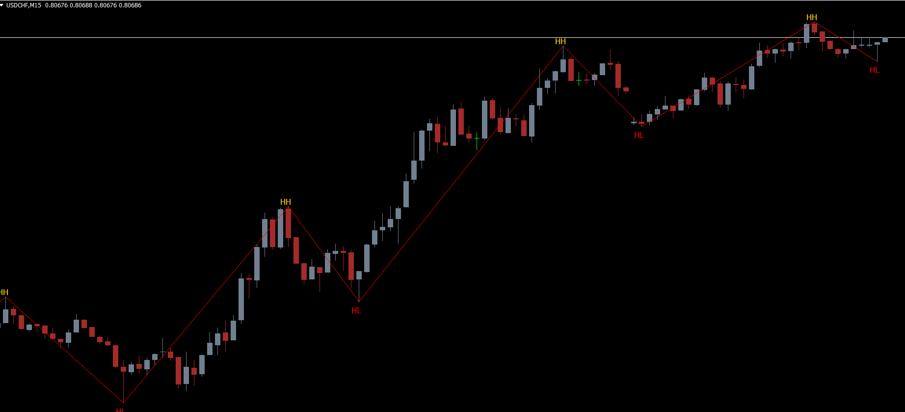 In a strong uptrend, each swing high is higher than the previous high, and each swing low is higher than the previous low.