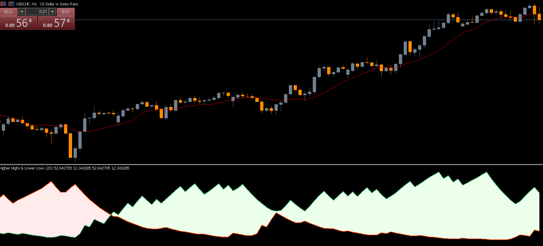 The Higher Highs – Lower Lows indicator evaluates price swings by analyzing market structure. A higher high suggests bullish pressure, while a lower low signals bearish momentum. The indicator incorporates these concepts into a visual oscillator with two colored trend lines: