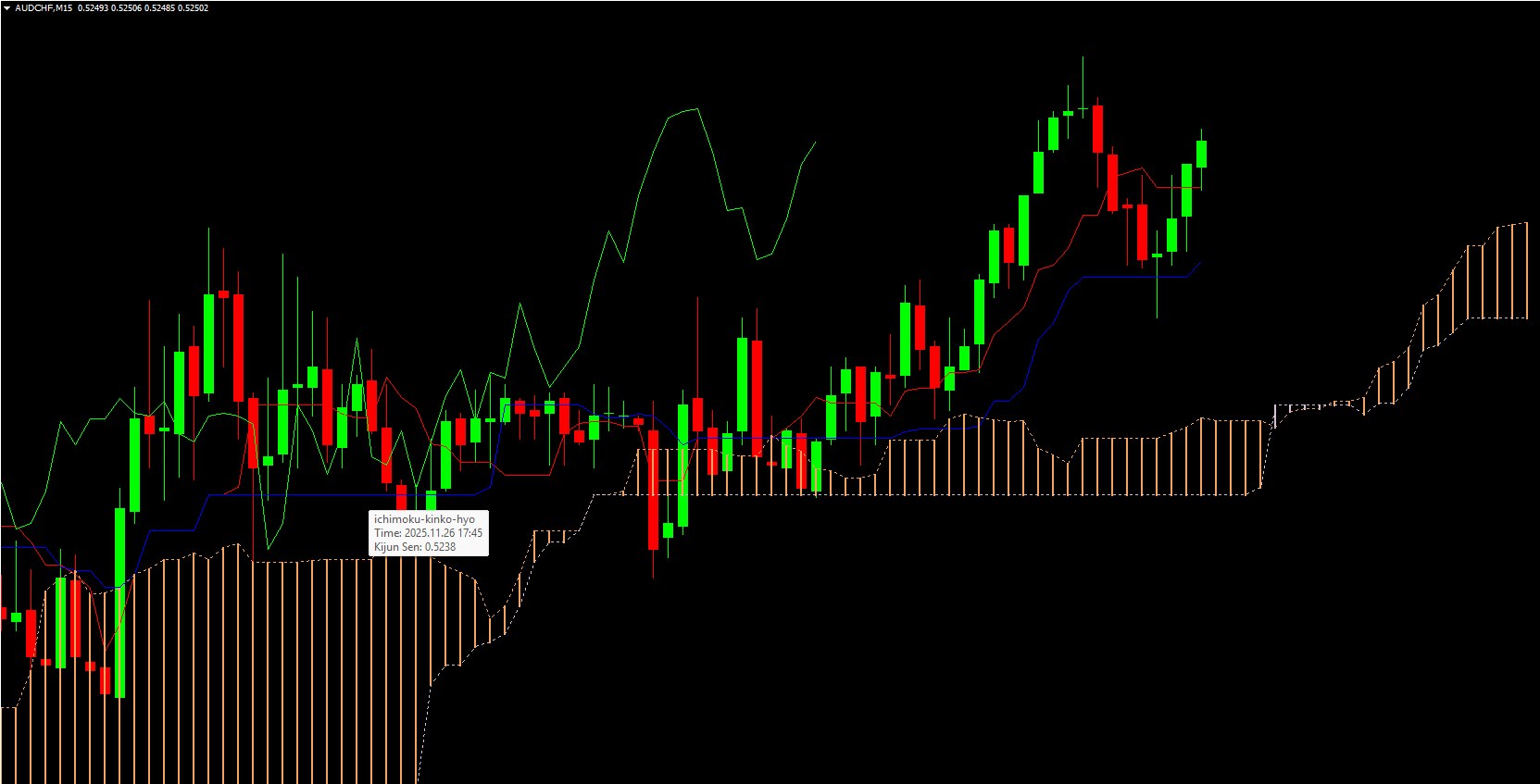 Example: Tenkan crossing Kijun upward while the cloud is bullish suggests a potential buy opportunity.