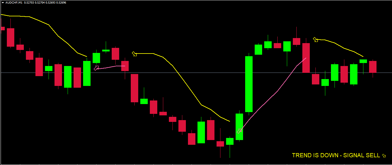 Bullish Trends: A pink line appears on the chart during upward price movement. Pink up arrows indicate buy signals.