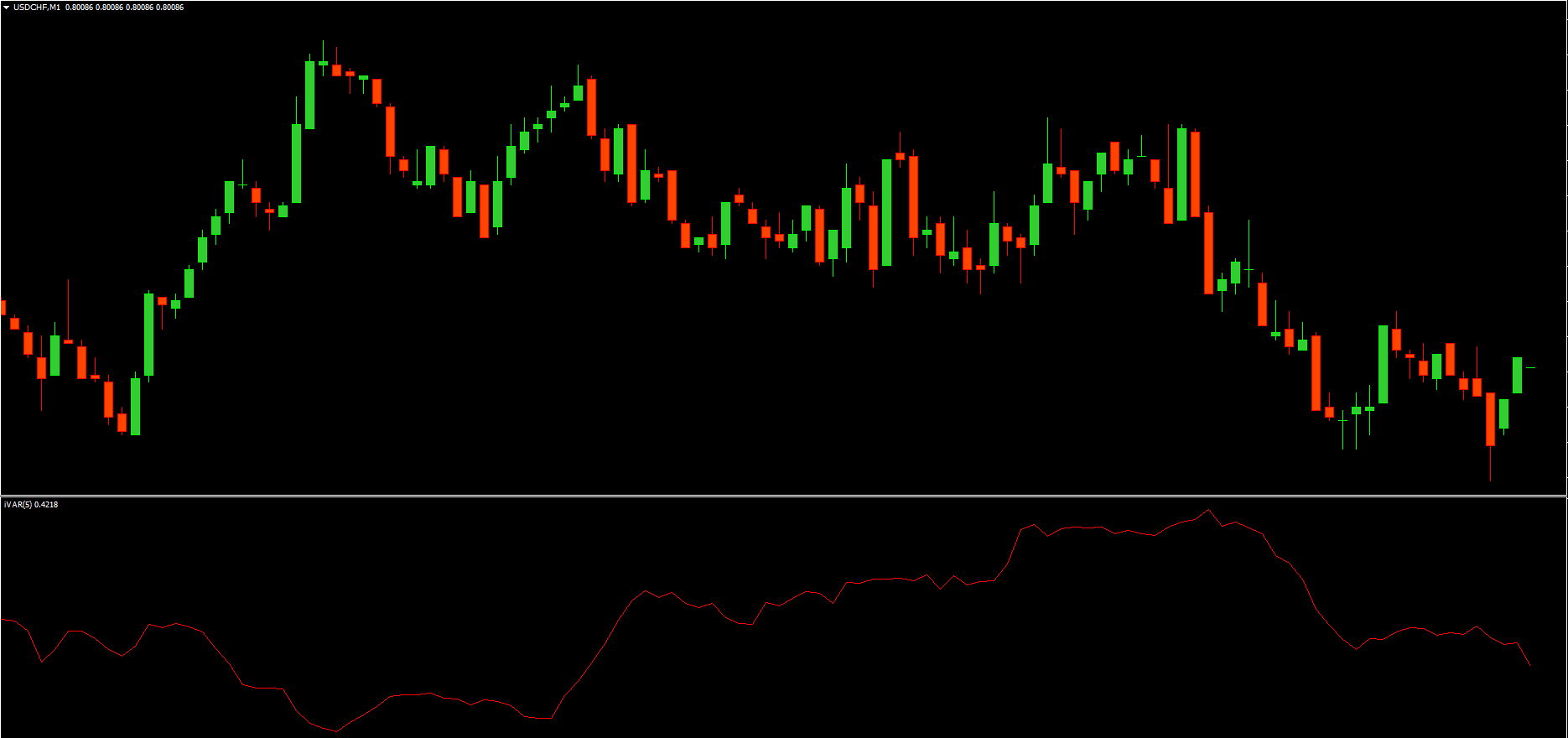 The iVar Indicator appears as a red oscillator line in a separate MT4 window. To interpret it correctly, traders should draw a reference line at the 0.5 level.