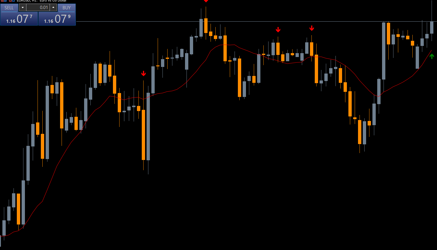 The indicator evaluates candle body relationships, market pressure, and price behavior before printing any signal. It provides a clear and visual representation of trend reversals, making it easier to spot high-probability trading setups.