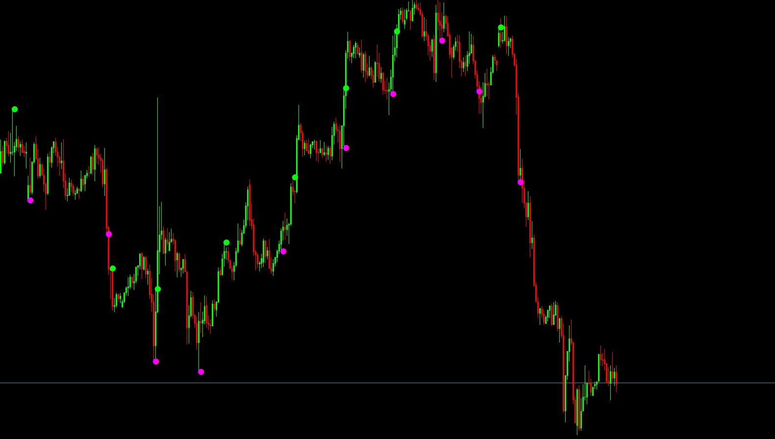 A green dot represents a sell signal, showing that price momentum is weakening and a potential downtrend could follow.