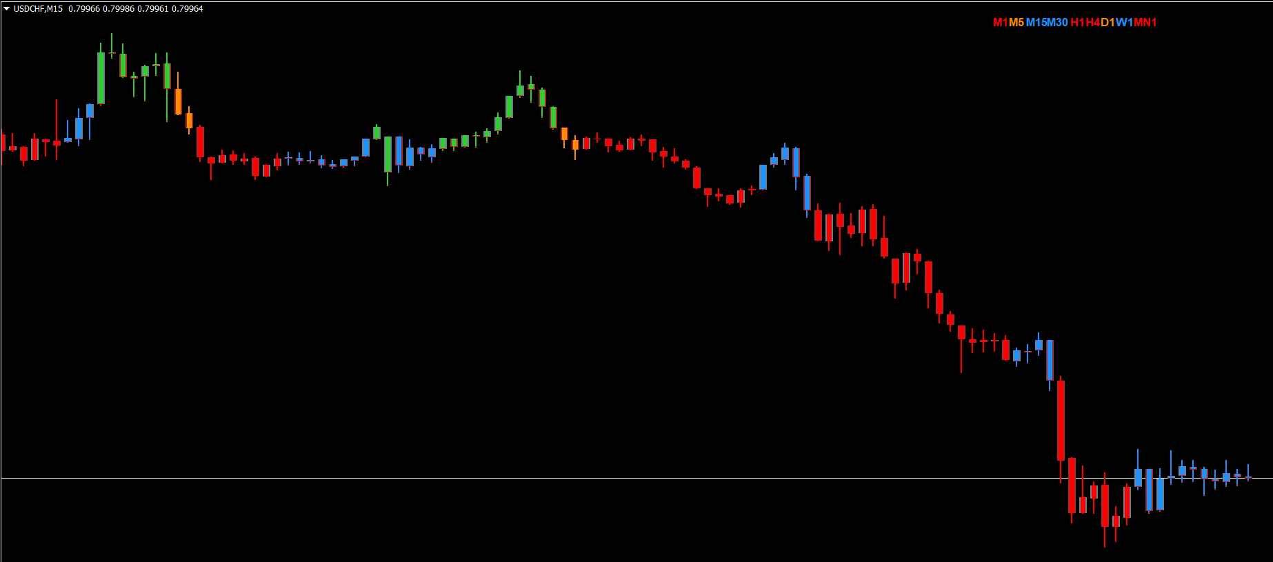 The MACD Trend Candles V3 Wide Indicator for MT4 visually represents trend direction and strength by changing candle colors according to the MACD signal line and zero line.
