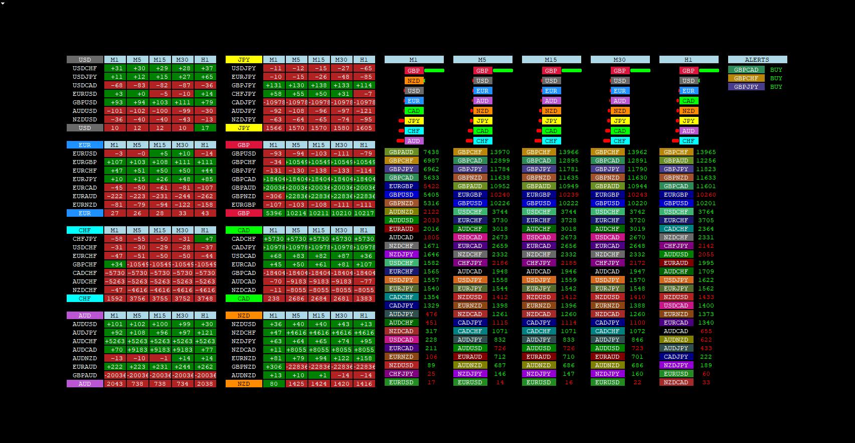 This system allows traders to compare relative strengths quickly — for example, if EUR and GBP show consistent green values while USD pairs display red, it indicates Euro and Pound dominance over the U.S. Dollar.