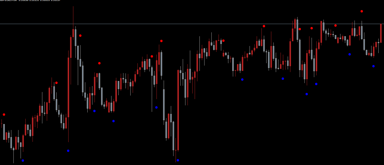 The indicator displays bullish signals as Blue dots and bearish signals as Red dots. Each dot represents a trading signal where traders can enter a position: