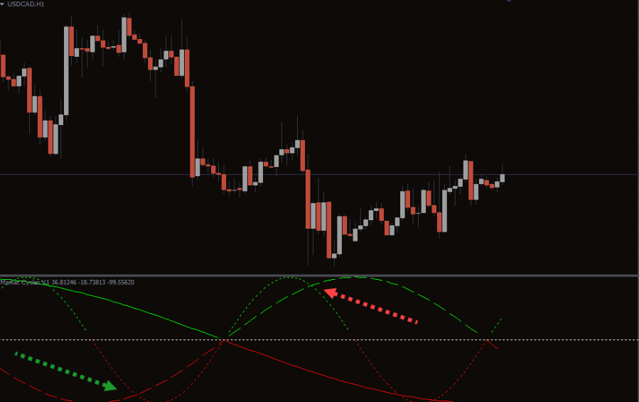 For example, in the USD/CAD chart, a green arrow indicates a sell signal where Cycle 1 moves below the other two cycles, and all bands are in the negative region. The market subsequently trends downward.