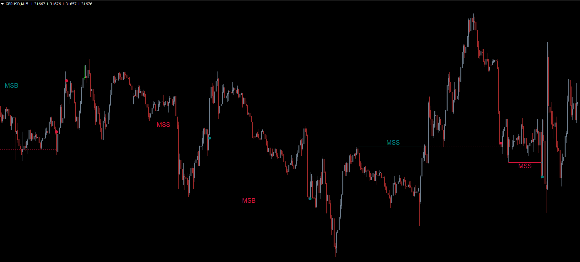 An MSB is confirmed when price breaks above or below the previous major swing that defined the trend.