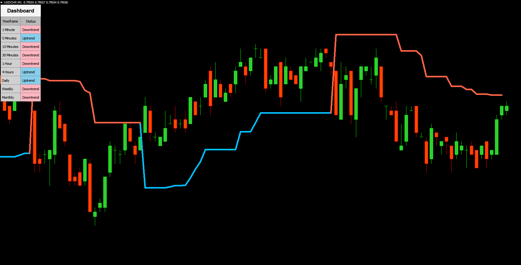 Unlike standard indicators that analyze one timeframe at a time, the Market Trend Scanner Indicator simultaneously examines several — from 1-minute to daily charts. This comprehensive approach reveals trend alignment and momentum consistency across timeframes, key factors in identifying strong trading signals.