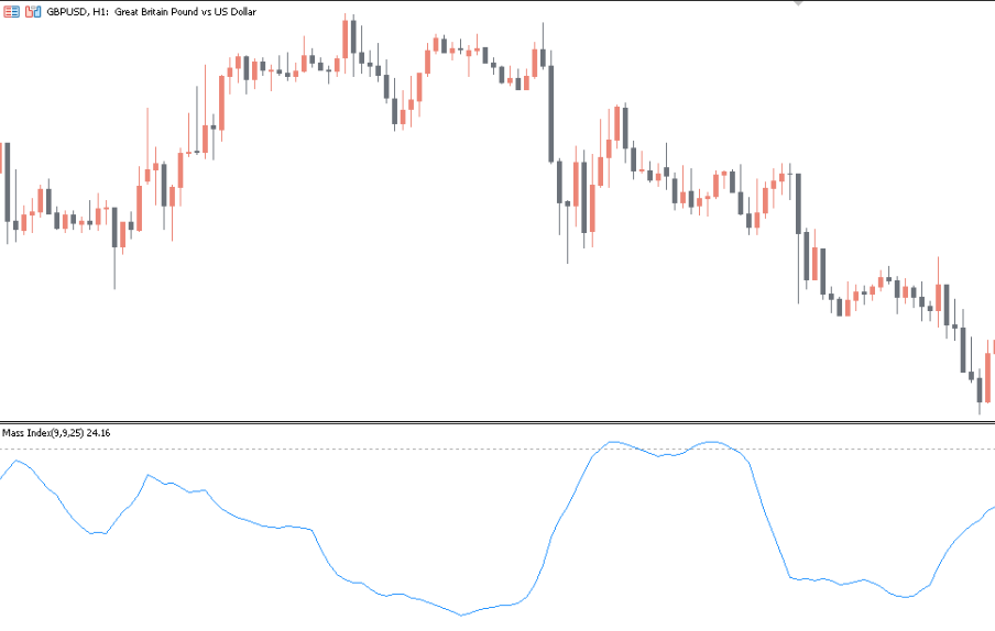 On a GBP/USD H1 chart, for example, the Mass Index often provides early warnings of trend reversals.
