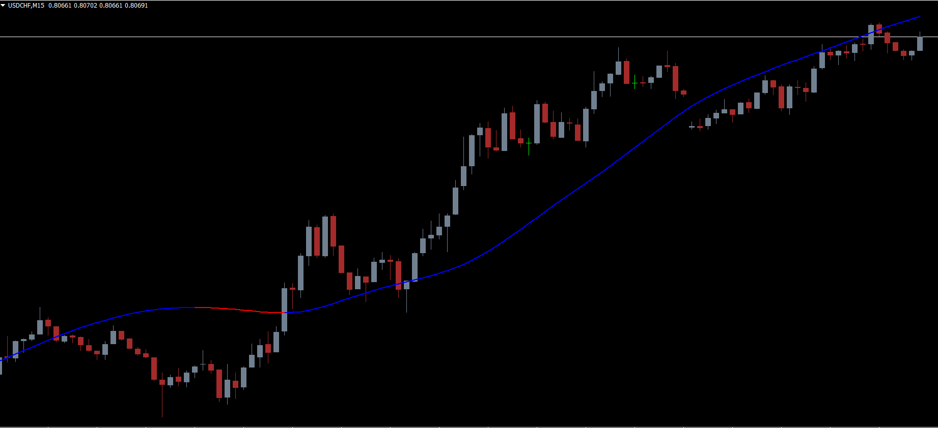 The main feature of the Mega Trend Indicator is its color-changing line, which makes identifying market trends straightforward: