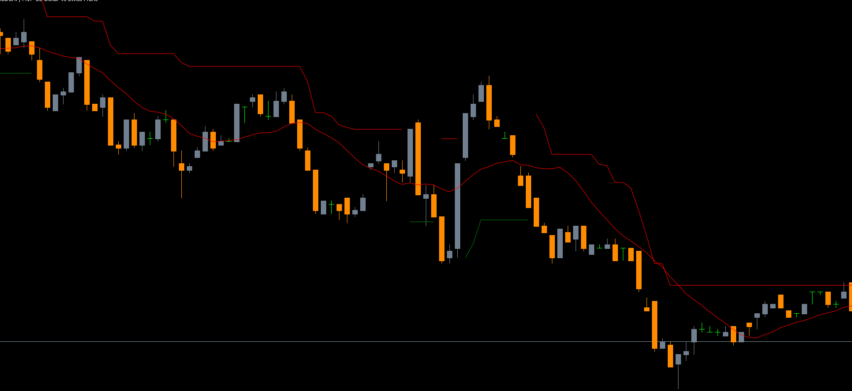 SELL positions: Trailing stops are plotted above the current price in RED.