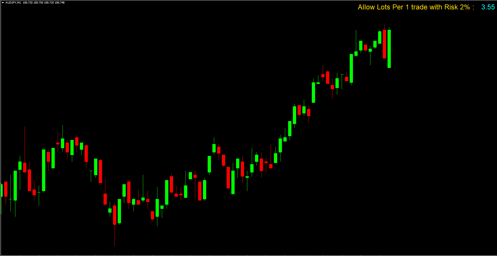 Once installed on your MetaTrader 4 platform, the indicator calculates and displays the recommended trading lot size at the top-left corner of your chart before you place a trade.