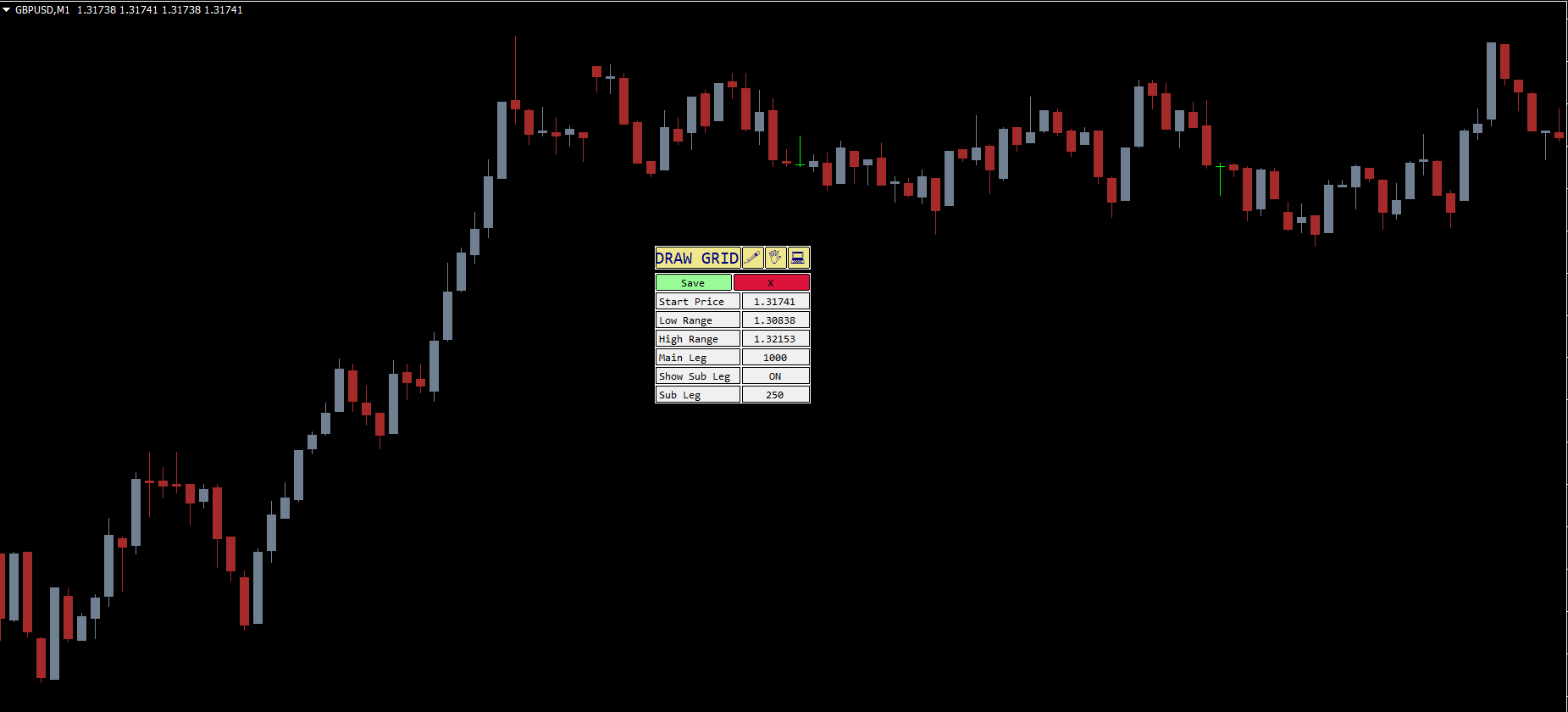 Once applied to the chart, the indicator presents an interactive options panel that allows traders to draw the grid instantly. The panel shows helpful information such as the current level’s starting price, the high/low range, and the leg being analyzed.