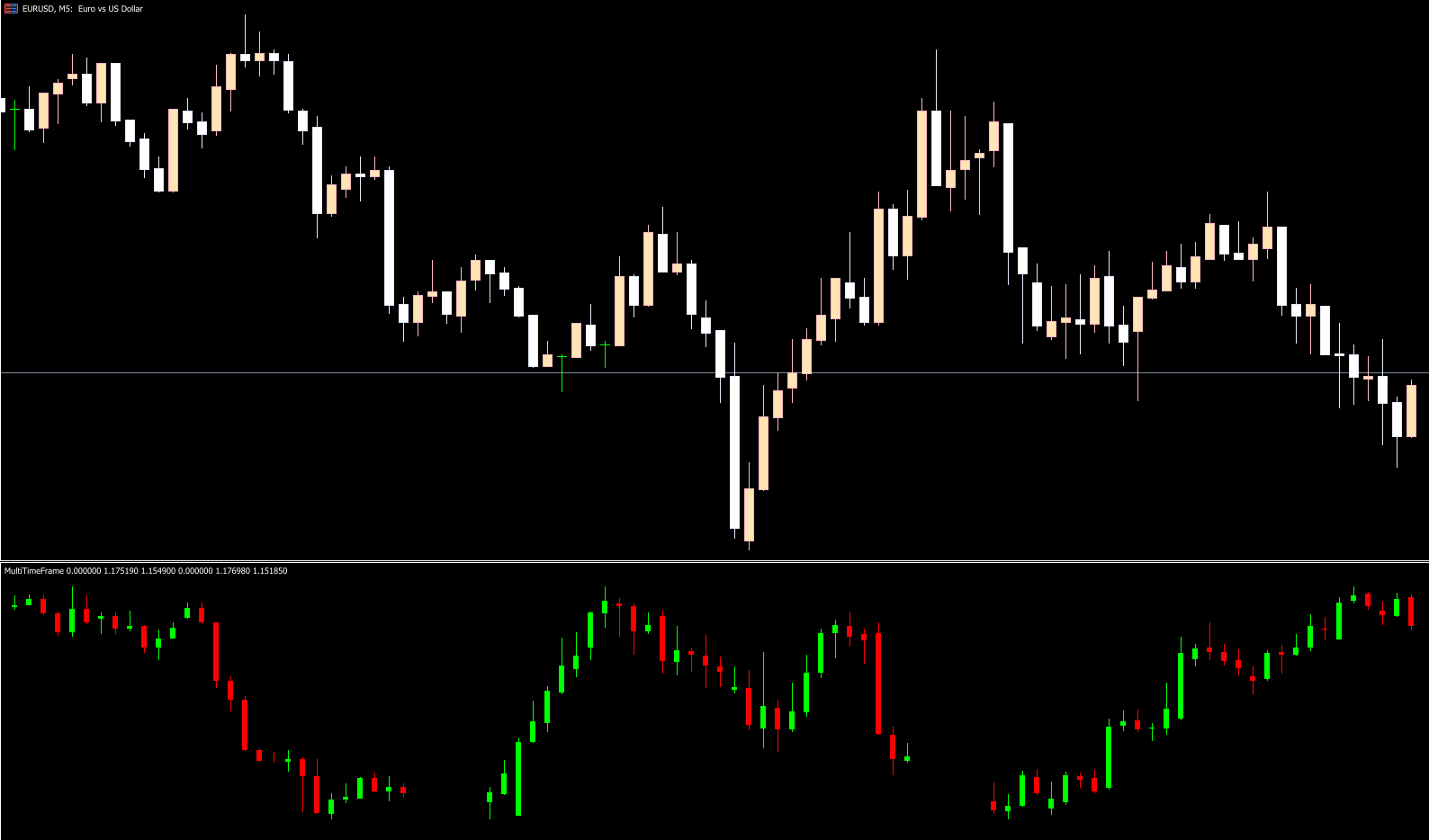 The MTF Indicator for MT5 allows traders to view three different timeframes in one chart window, from higher to lower: