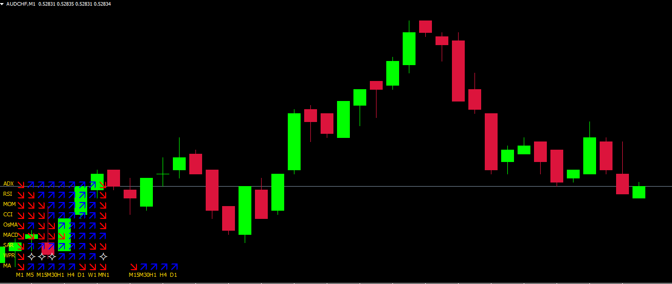 After installing the indicator in your MT4 terminal, open your desired currency pair or asset. Add the Multi Trend Signal Indicator to the chart — you’ll see multiple colored arrows corresponding to each indicator and timeframe.