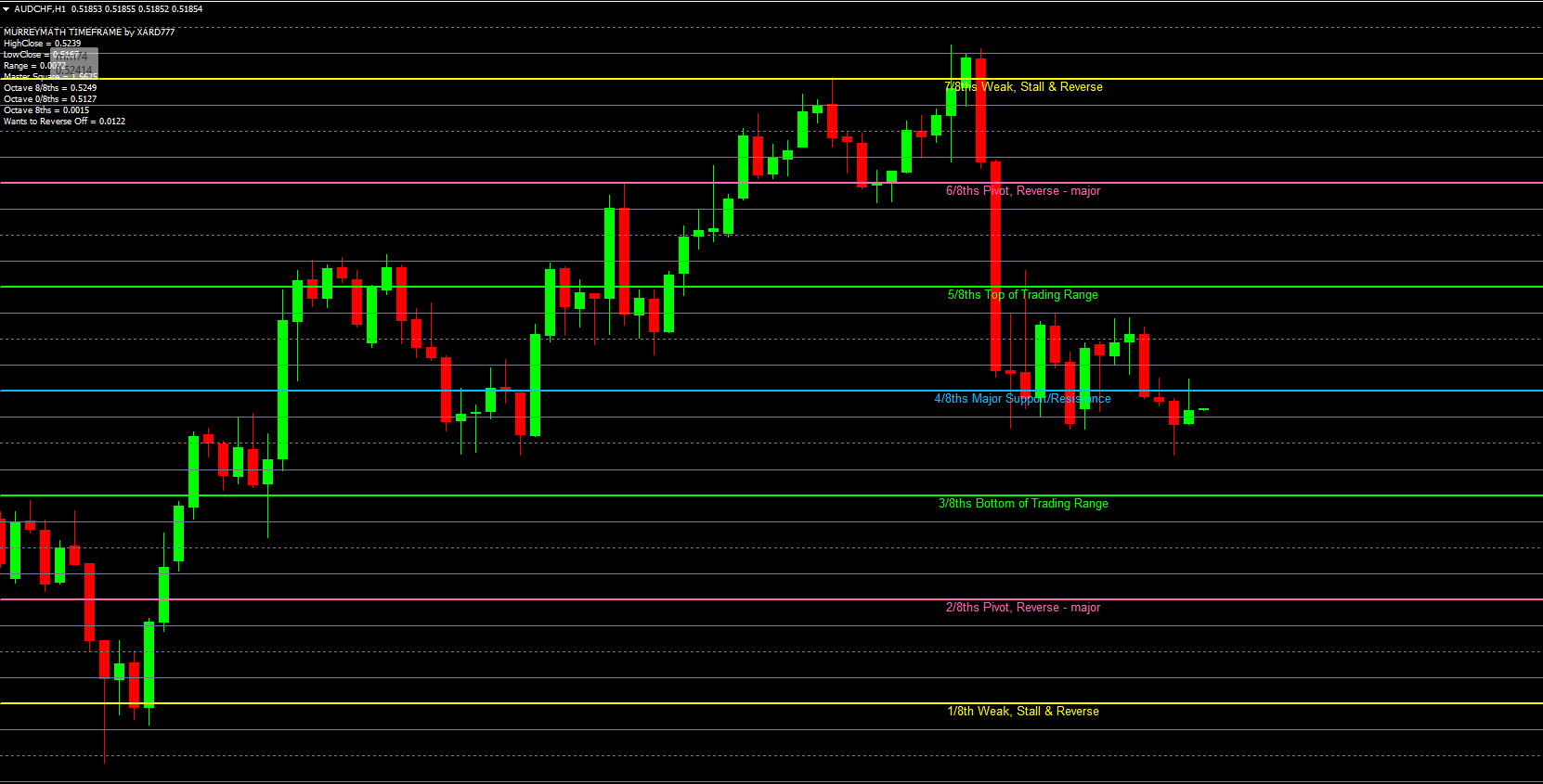 The Murrey Math Time Frame Indicator for MT4 is a technical tool that divides the price chart into eight equal increments, creating nine pivot points ranging from 0/8 to 8/8. These levels provide traders with key support and resistance zones, as well as overbought and oversold conditions, enabling precise entry and exit decisions.
