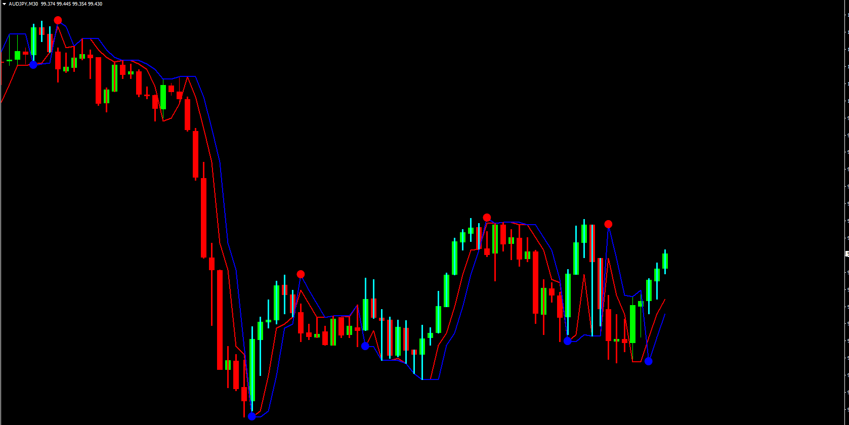 Additionally, the indicator plots red and blue dots directly on the chart: