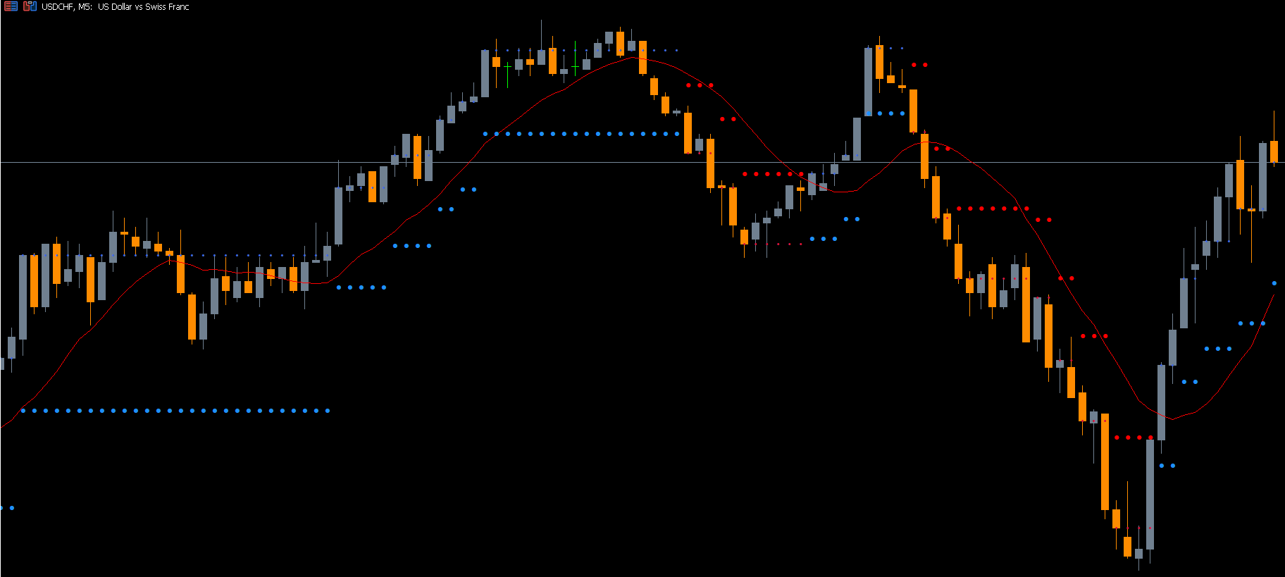 During a downtrend, the indicator displays more resistance lines. Conversely, in an uptrend, it primarily shows a single support line. Red dots indicate a downtrend, while blue dots indicate an uptrend.