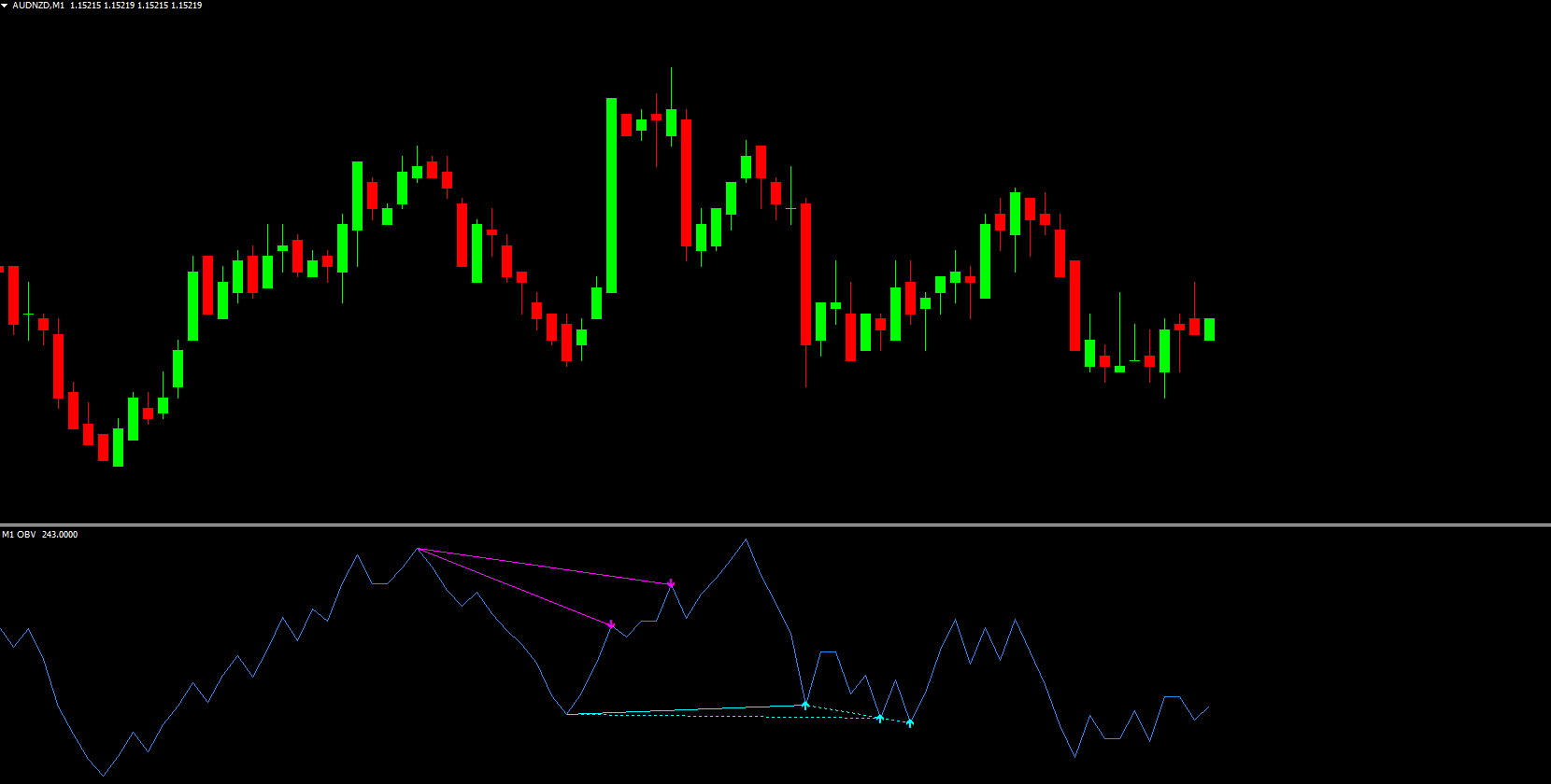 Bearish Divergence: Price makes a higher high, OBV makes a lower high – signals a potential downward move