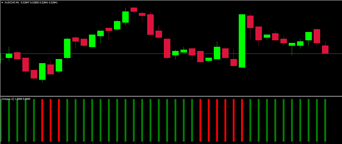 The Octopus 1 Indicator for MetaTrader is a custom-built technical analysis tool that helps traders identify and follow market trends with ease. It uses colored histogram bars to represent different market sentiments: