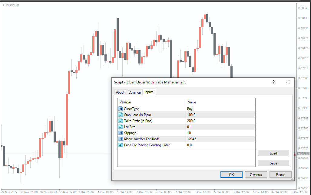 Drag and drop the script onto your desired chart (for example, the AUDUSD pair).