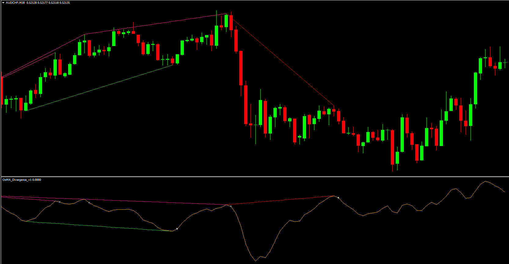 Bearish divergence: price makes higher highs, OsMA makes lower highs