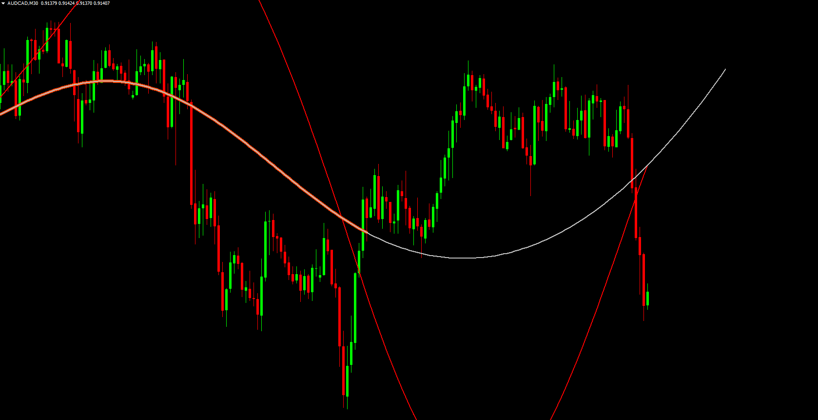 At its core, the PanPrizMA Leverage Indicator for MT4 uses a second-degree polynomial equation to fit a sine wave curve through price data. This approach minimizes market noise and provides a mathematically optimized representation of the current trend.