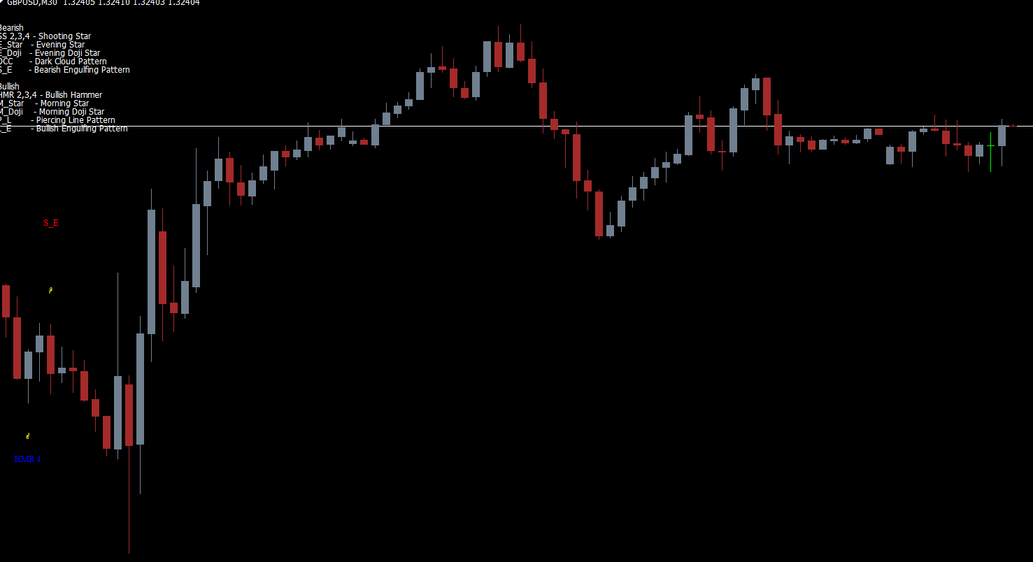 The Pattern Recognition Master Indicator identifies candlestick patterns on live charts in real-time. It marks each new candlestick pattern with letters directly on the chart. To make it easier for traders, the top-left corner of the chart explains what each letter represents.