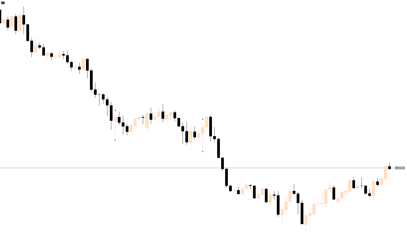 The Pin Bar Indicator for MT5 identifies the classic pin bar candlestick pattern on any timeframe, including intraday charts and daily, weekly, or monthly charts. Once detected, the indicator plots rounded dots on the chart: green dots for bullish reversals and red dots for bearish reversals.