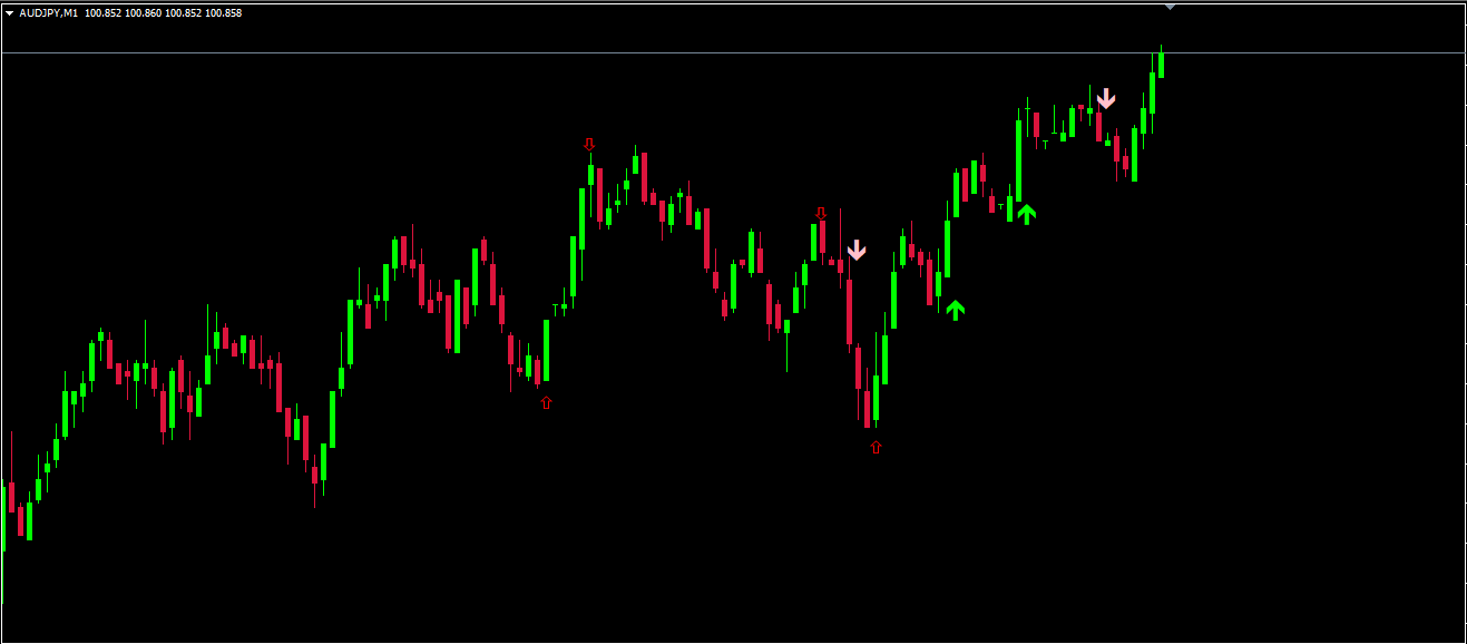 At its core, the Price Action Trend Indicator for MT4 uses market momentum and price behavior to plot arrows on the chart. When the indicator detects upward momentum, a lime arrow appears, signaling a potential buy opportunity. Conversely, when momentum weakens or reverses, a pink arrow appears, suggesting a sell opportunity.