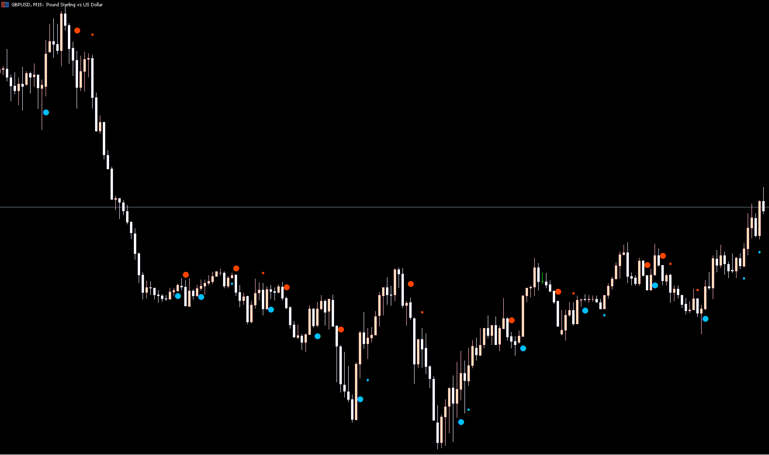 The Price Channel Signal Indicator helps traders quickly identify major swing highs and lows, enabling them to understand whether the market is currently trending upward or downward. It displays colored dots along the chart: