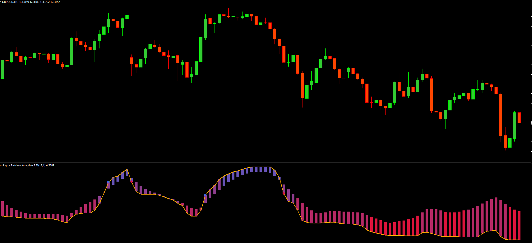 The Rainbow Adaptive RSI indicator operates on two main principles: adaptive sensitivity and visual signaling.