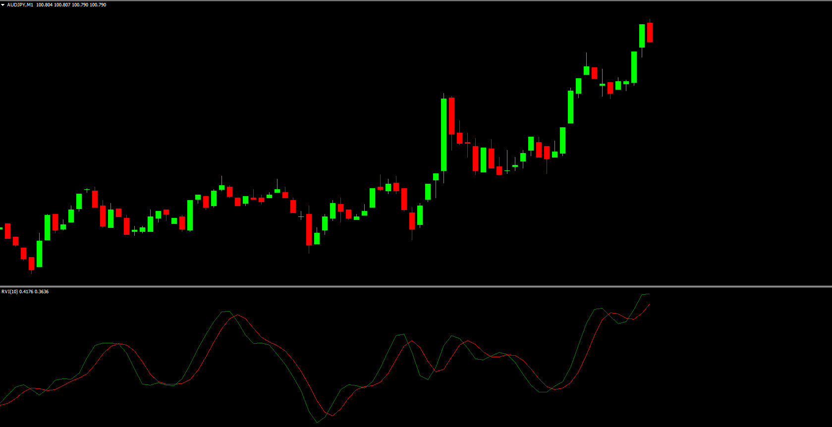 RVI Above Signal Line: Green line above red line indicates a potential bullish trend.