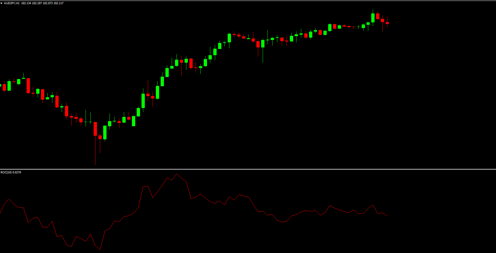 When applied to an H4 EURUSD chart, the ROC indicator plots in red within a separate oscillator window. Traders can immediately identify zero line crossovers, momentum spikes, divergences, and trend weaknesses.