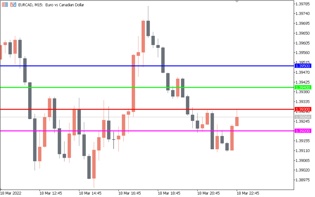 For example, on the EUR/CAD M15 chart, the Round Levels Indicator highlights key price zones ending in .00 or .50. These zones show important institutional activity. Once price reaches these areas, it often reacts sharply, indicating that market makers have pending orders or are executing large trade volumes at these prices.