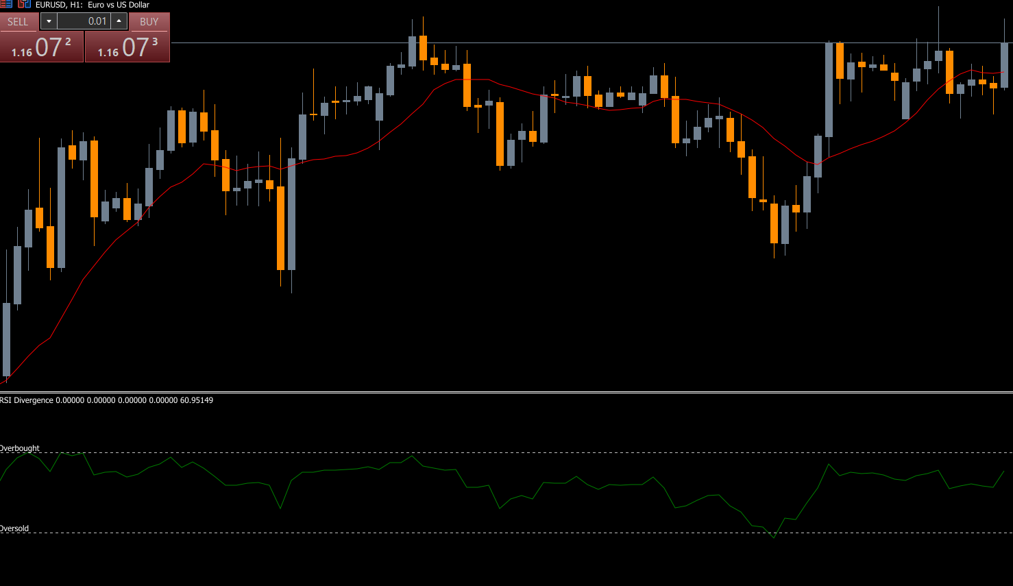The RSI Divergence Indicator for MT4 simplifies detecting buy and sell signals by automatically highlighting bullish or bearish divergence on the chart.