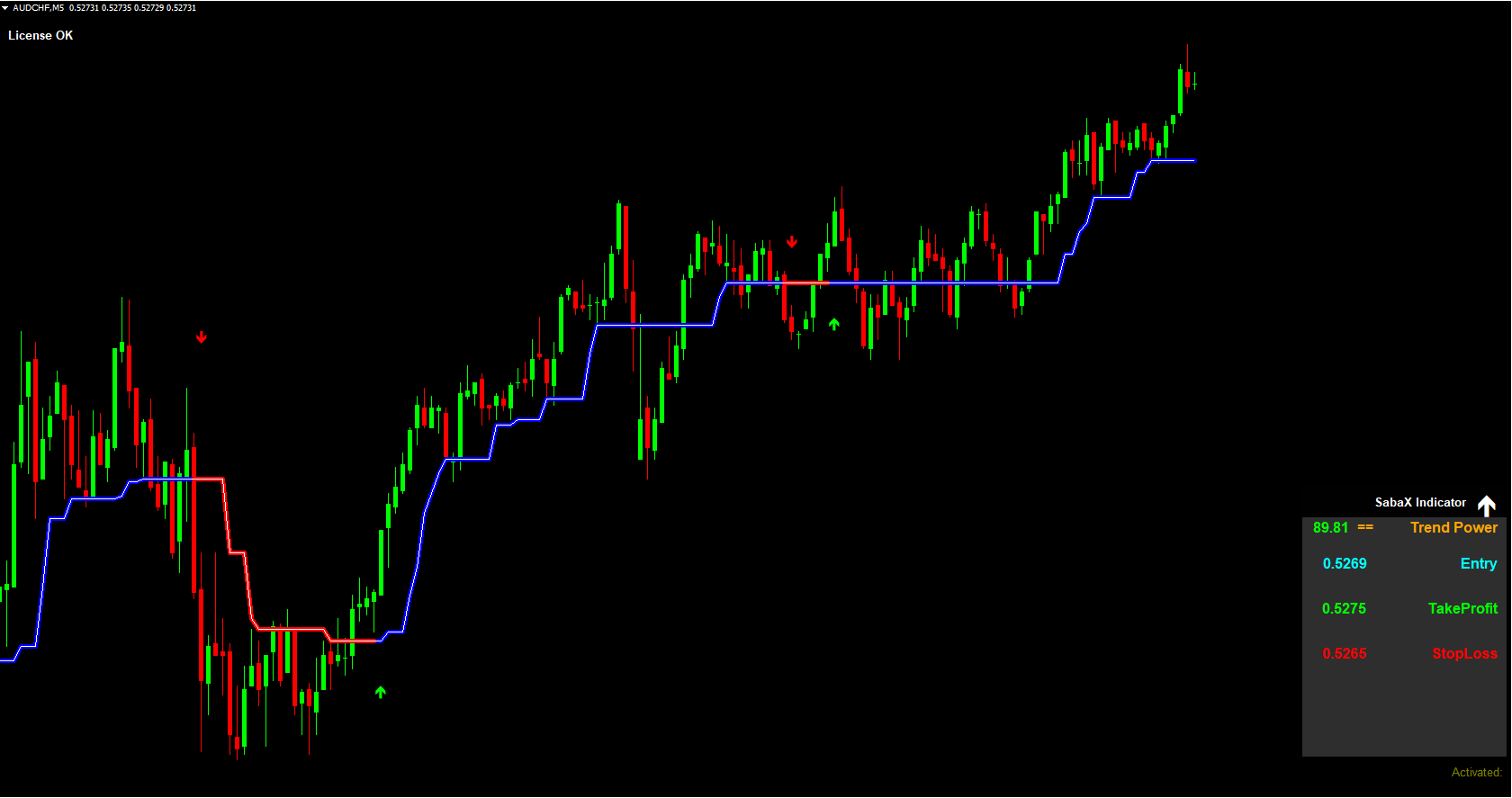 When the trend direction shifts, SabaX updates its display in real time. For example, when momentum turns bullish, the indicator switches to a blue line and prints a green arrow indicating a potential buy opportunity. Alongside this signal, the panel on the right side of the chart shows precise levels for: