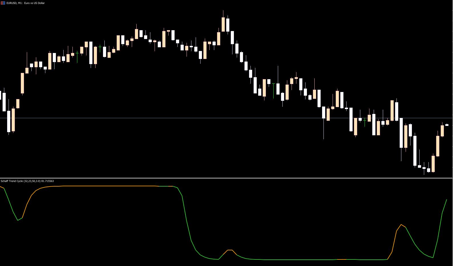When applied to the EURUSD Daily chart (as in the example), the Schaff Trend Cycle appears in a separate indicator window. It displays trend cycles using two simple colors: