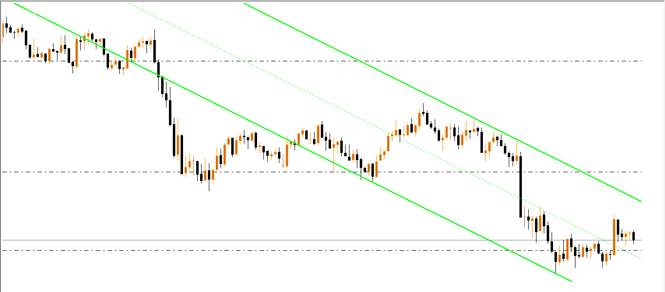 The dotted middle line acts as a dynamic equilibrium or trend reference point.