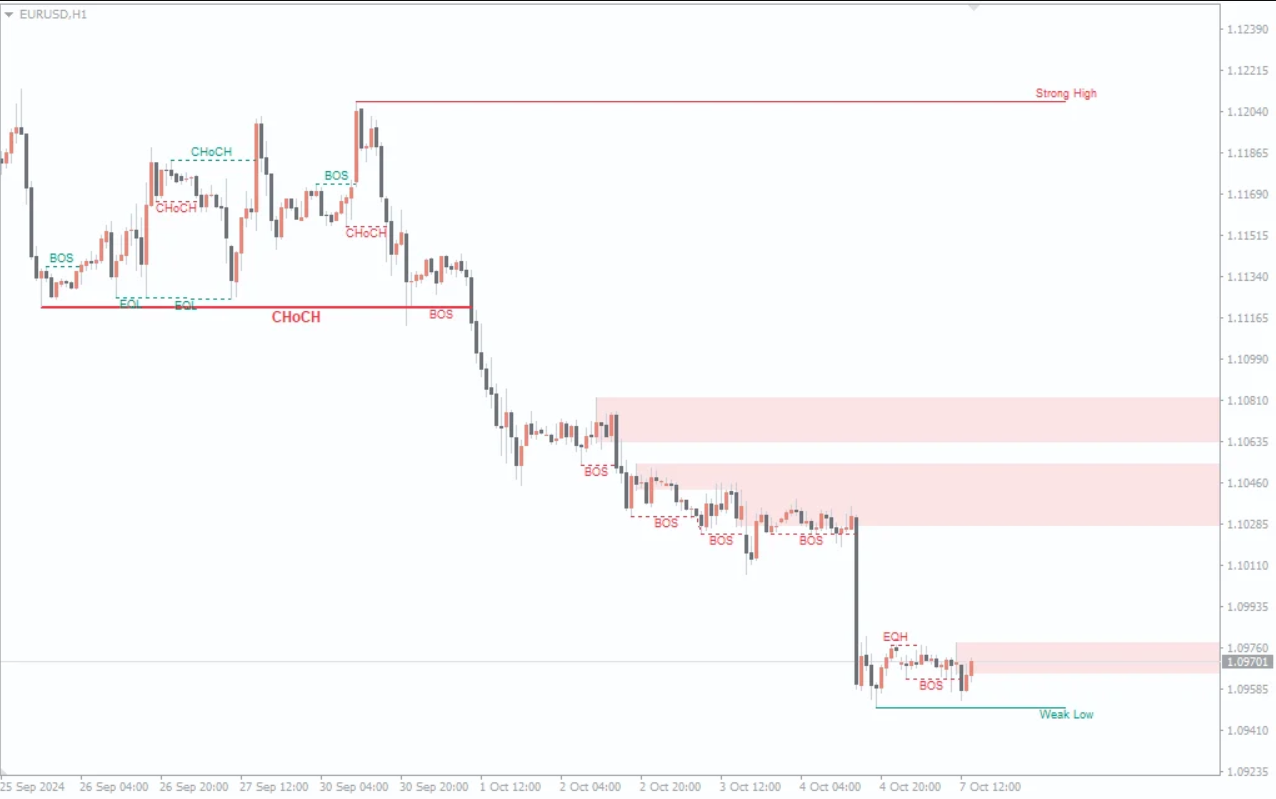 Liquidity areas such as Equal Highs (EQH) and Equal Lows (EQL) are also displayed. These are critical levels where price often returns to grab liquidity before continuing its trend.