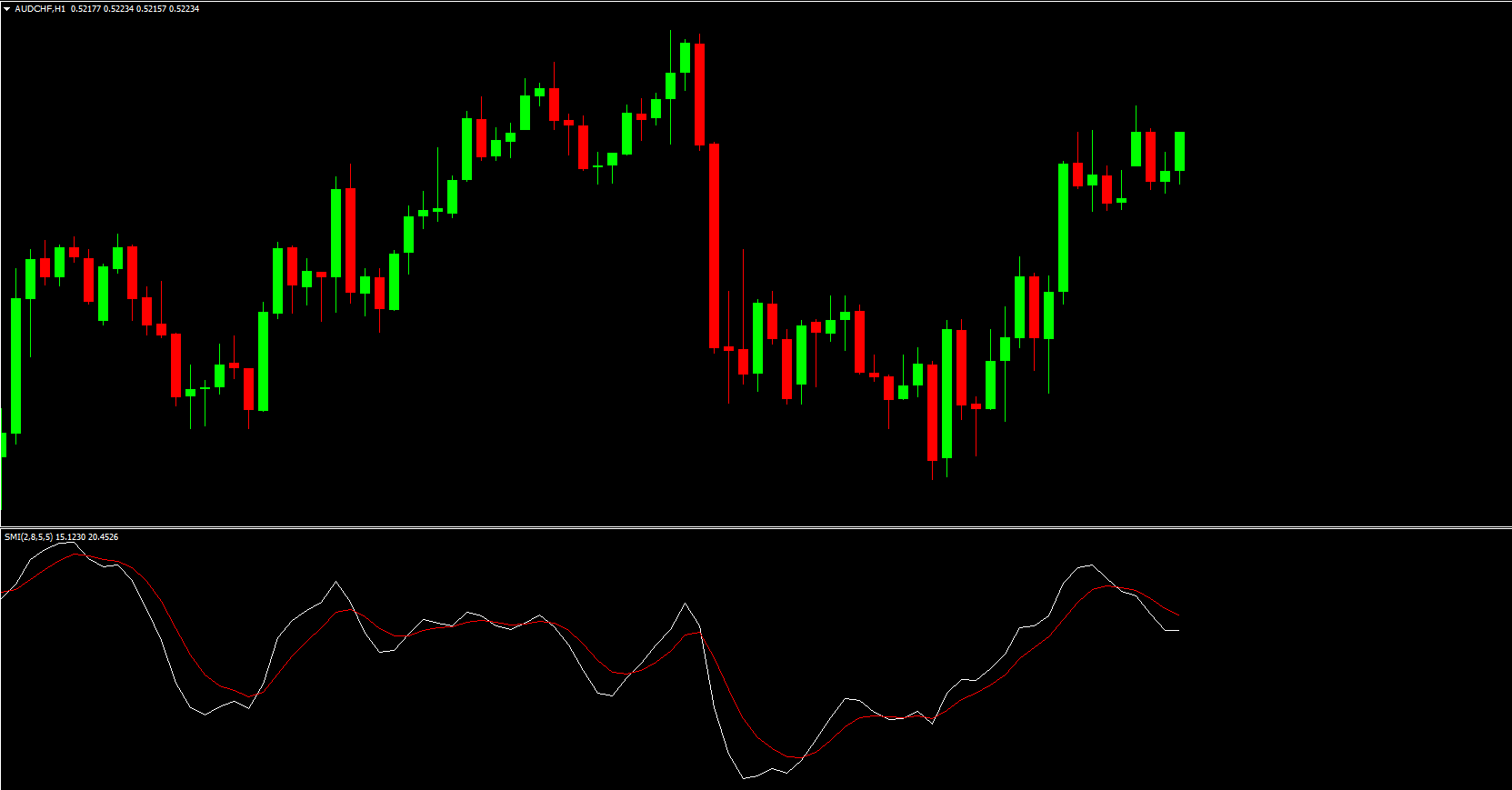 The SMI Indicator plots two oscillator lines—typically white and red—within a separate indicator window. These lines reveal momentum strength and help identify turning points in the market.