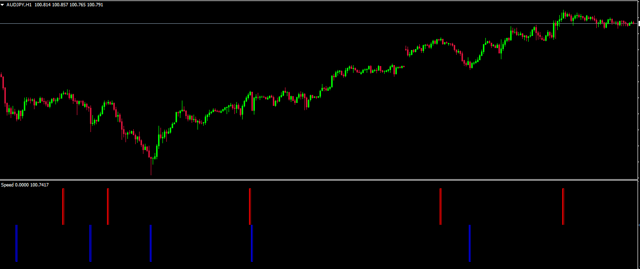 The Speed Indicator functions as an oscillator, meaning it fluctuates within a fixed range — from -1.2 to 1.2 — representing the momentum of price movement.