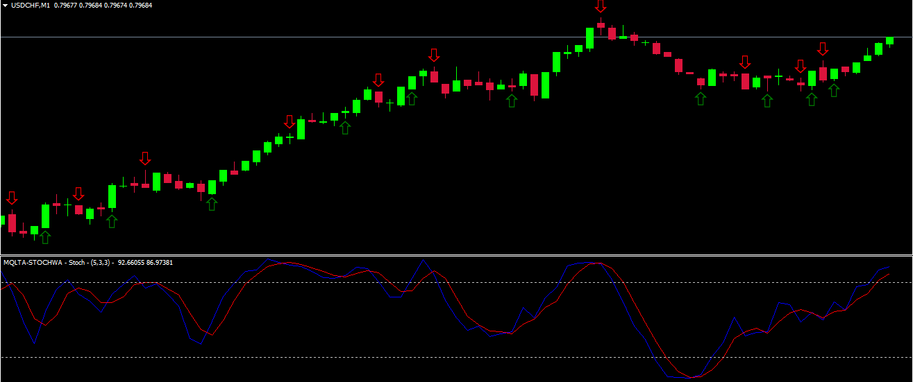 The indicator uses the Stochastic Oscillator’s main and signal line crossovers to generate high-probability trading signals.