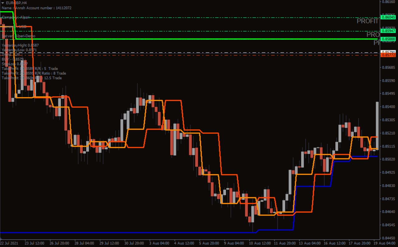 Observe the buy/sell levels, stop-loss, and take-profit lines.