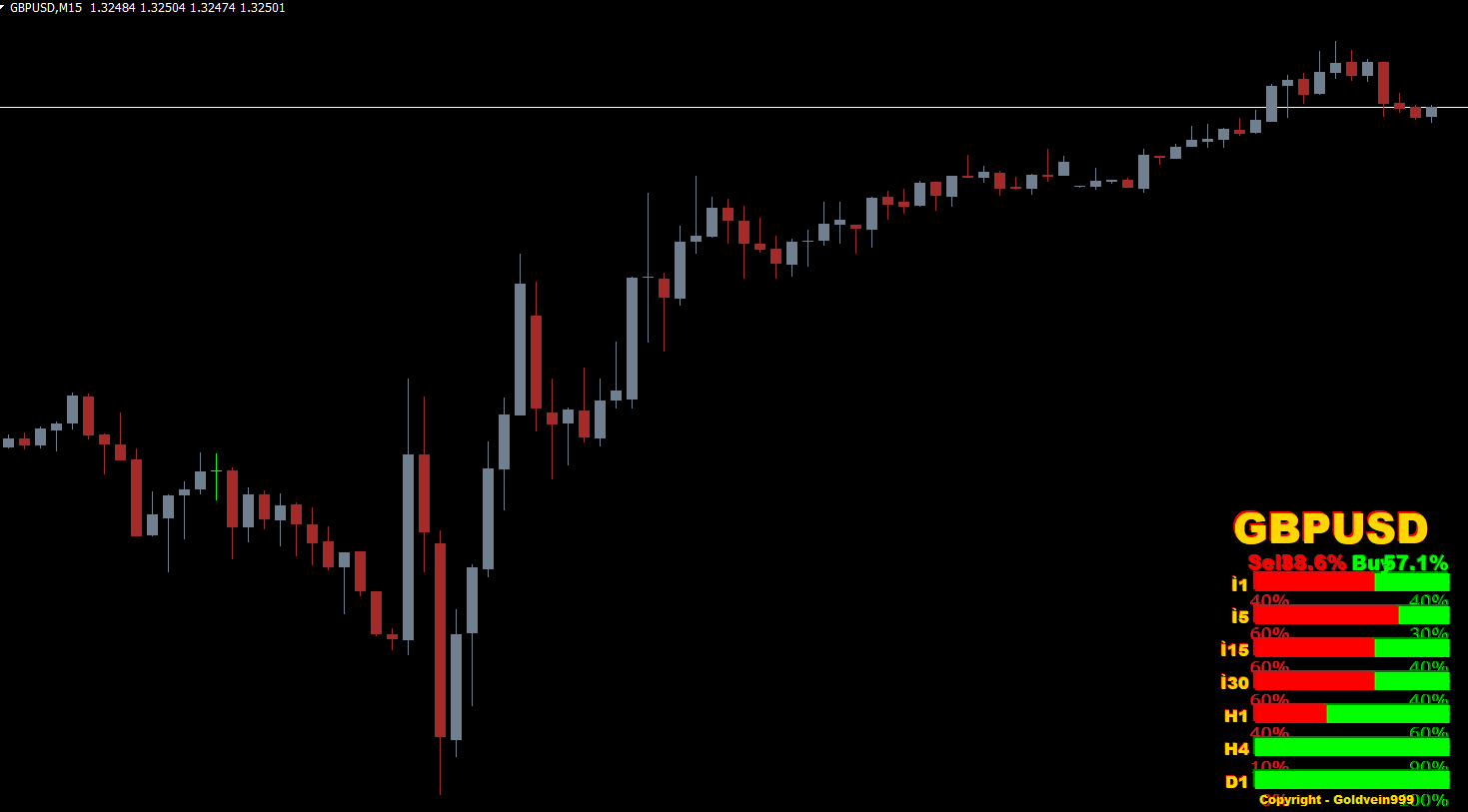 This indicator displays a percentage bar on the right side of the chart. Green percentages represent bullish strength, while red percentages represent bearish strength. With this clear visual layout, traders can easily assess the strength of the current market momentum without complex analysis.